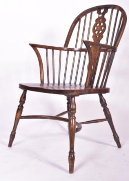 An early 20th century elm hoop / wheel back elbow Windsor chair. With vase back, saddle seat with flat elbow rests. Turned angular legs with crinoline stretcher. Measures approx. 105cm x 54cm x 53cm