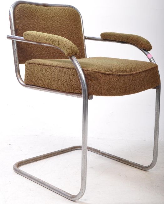 British Modern Design - A mid century chrome cantilever office - dining chair. Tubular chrome frame with overstuffed original fabric seat and back rest. Upholstered elbow rests either side. Measures approx: 85x52x45cm