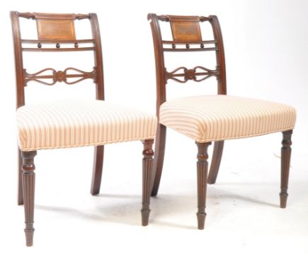 A harlequin set of six 19th and early 20th century dining chairs and Regency mahogany pedestal dining table. The collection of chairs to include reeded twist back examples with overstuffed seats, alongside Edwardian mahogany inlaid chairs. The chairs together with a Regency mahogany pedestal D end dining table. Featuring splayed reeded legs terminating in brass paw feet over castors.