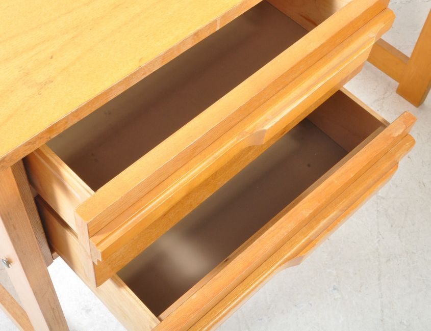 Schreiber Furniture - A mid 20th century teak wood writing table desk. The desk raised on squared supports and lower returns. Open kneehole recess flanked by a pair of floating drawers.