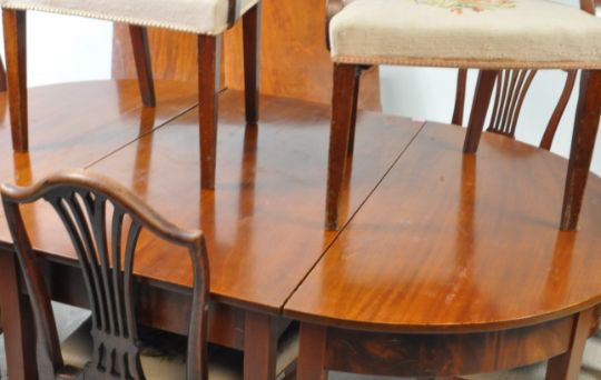 An early 19th century George III D end dining table together with a set of 8 dining chairs chairs. Each chair with embroidered seat upholstery, the table with d-ends and central table having additional leaves