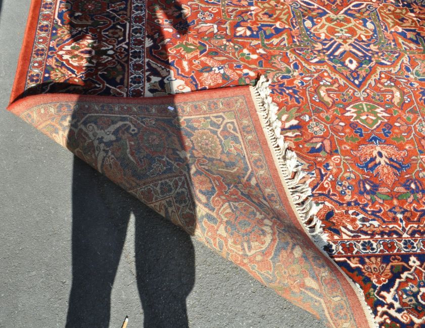 Northeast Iranian Persian Meshed large floor carpet rug. The large rug with repeating patterns within geometric inner border, set on red ground. Measures approx: 368x273cm