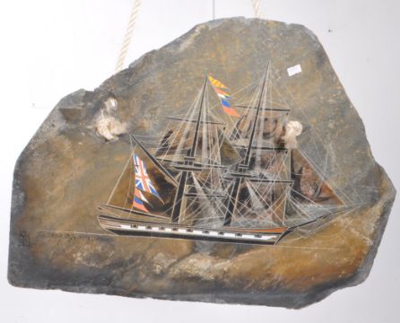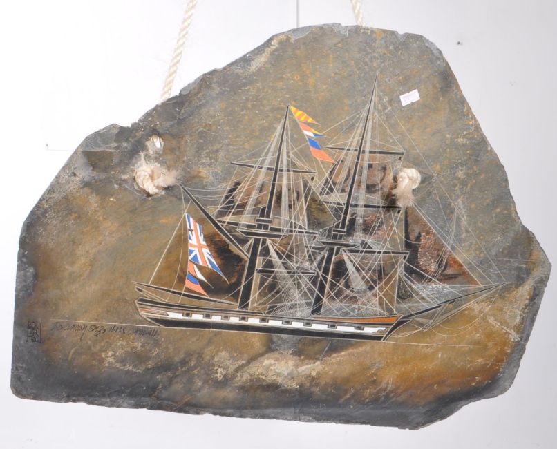 Cornish Folk Art - A 20th century folk art West Country painting on slate. Depicting HMS cornwall, tall ship / painting on Cornish slate. Measures approx: 51x65cm