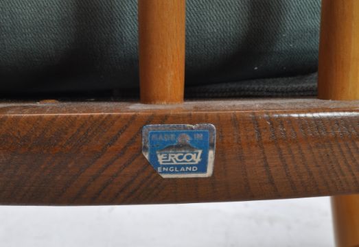 Ercol - A vintage mid 20th century Ercol elm and beech dining table and chairs. The table raised on squared supports, with circular drop leaf top. Each chair having spindle back design, with moustache bar back atop. Chairs AF. Measures approx: 72x43x63cm