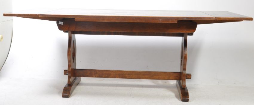 An early 20th century oak drawer leaf dining table. The dining table raised on shaped trestle style legs, united by a central stretcher. Having a rectangular top above. Measures approx: 74x147x90cm 207cm ext