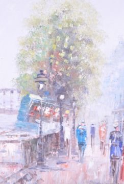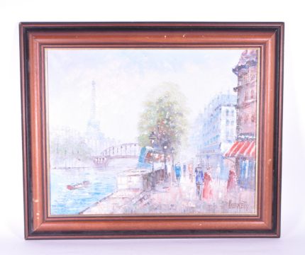 Manner of Caroline C. Burnett (1877-1950) - An early 20th-century oil on canvas painting of a Parisian street landscape. Depicting several figures walking in front of tall, Parisian buildings and the Eiffel tower. Framed, and signed to the 'Burnett' bottom right corner.