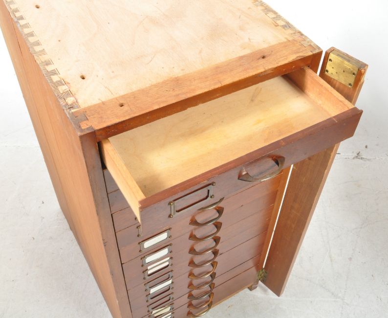 1920's oak 14 drawer pedestal filing cabinet. The drawers with pull handles and paper notation slides. Measures approx: 80x39x55cm