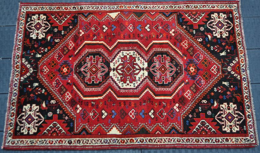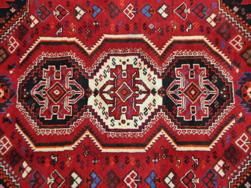 A vintage 20th century South West Persian Islamic Qashqai carpet floor rug. Red and blue ground with central diamond medallions with animal figures encapsulated in central panel. Further repeating geometric pattern to border.