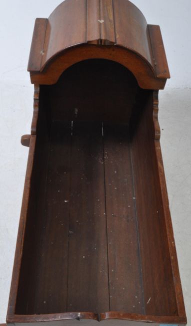 Victorian late 19th century mahogany childs rocking cradle. Featuring a hooded canopy over a rectangular boxed body raised on two curved legs for rocking the crib.