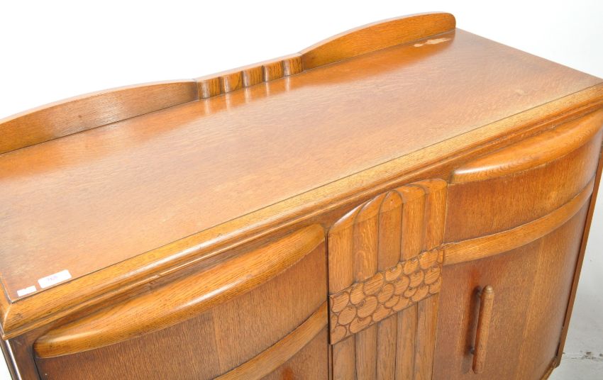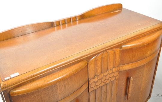 An early 20th century Art Deco manner 1940s light oak sideboard credenza. The sideboard raised on block feet. Having bowfront doors to either side with central reeded and carved panel. Gallery back to top. Measures approx: 96x120x52cm