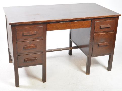 British Modern Design - An early 20th century Air Ministry style pedestal writing desk. The desk having a bank of drawers either side of a central kneehole. Raised on block feet.