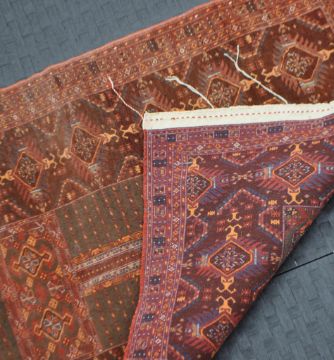 Afghan Turkmen Art Deco mid 20th century carpet floor prayer rug. In a brown ground with repeating medallions to border with green central panel and further repeating geometric pattern to outer border.