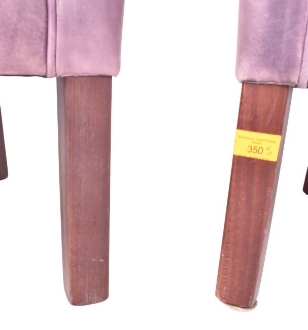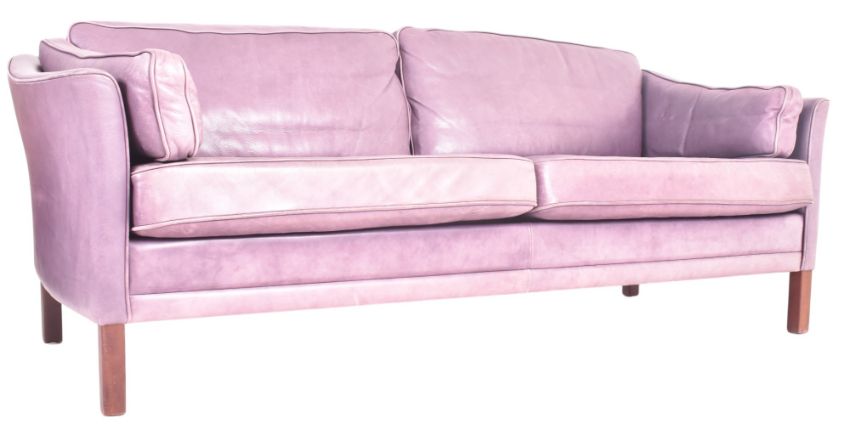 Mogens Hansen - Model MH80 / MH - a retro 20th century Danish Designer three piece sofa suite. The suite comprising a two seater sofa and matching pair of armchairs. Each upholstered in violet leather with each raised on straight leg supports.
