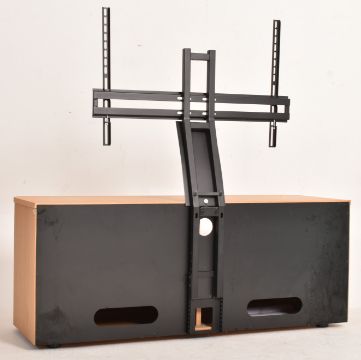 Richer Sounds - a modern oak designer TV / Hi-Fi media stand. Metal TV detachable bracket over an oak open base having a glass shelf set within over a single-blind fronted drawer.
