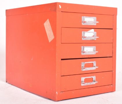 A graduating pair of retro 20th century filing cabinet chests. Each of upright pedestal form having steel ring handles and notation slides. Each finished in a vibrant orange colourway.