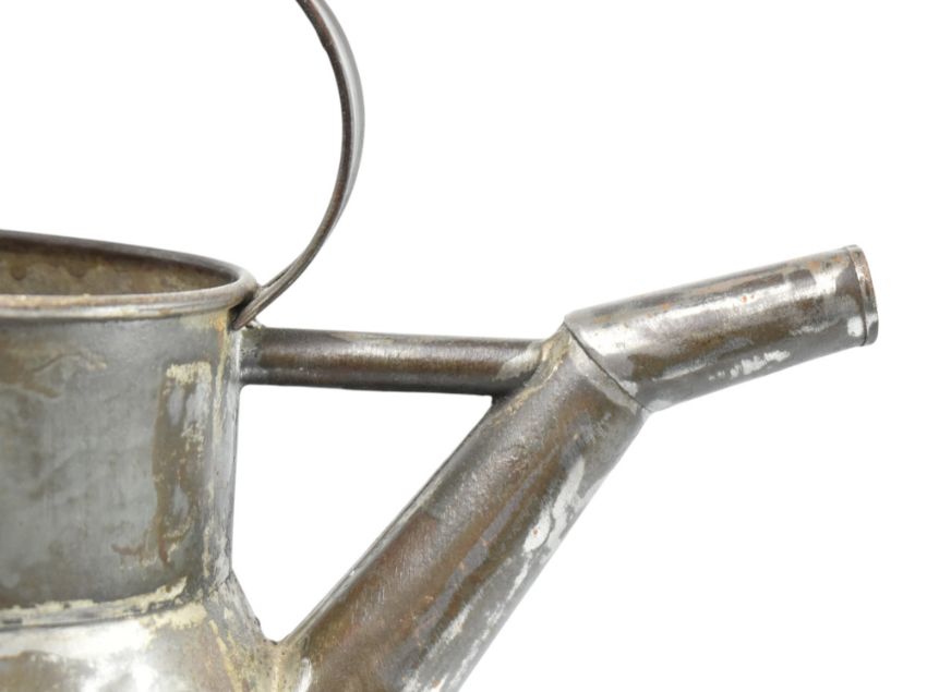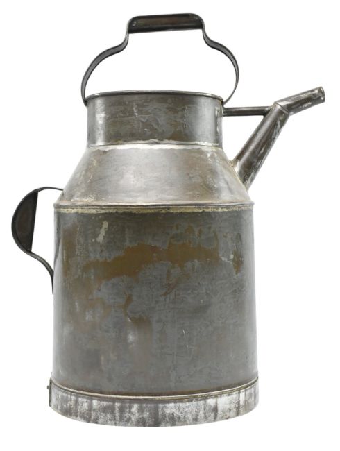 A vintage 20th century metal watering can jug. The can having a shaped handle top over a further handle to back and front spout. Cylindrical body.