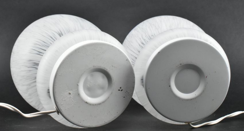 A pair of believed Italian vintage 20th century mottled glass bedside desk table lamps lights. Each lamp having a bulbous shaped body with narrow detail towards base. Each raised on circular bases. Sold as untested.