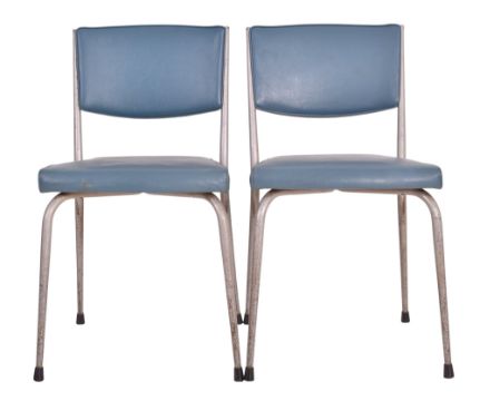 PEL Furniture - a matching set of six retro 20th century dining / cafe stacking chairs. Each chair having tubular metal frames with padded seat and backrest upholstered in blue rexine.