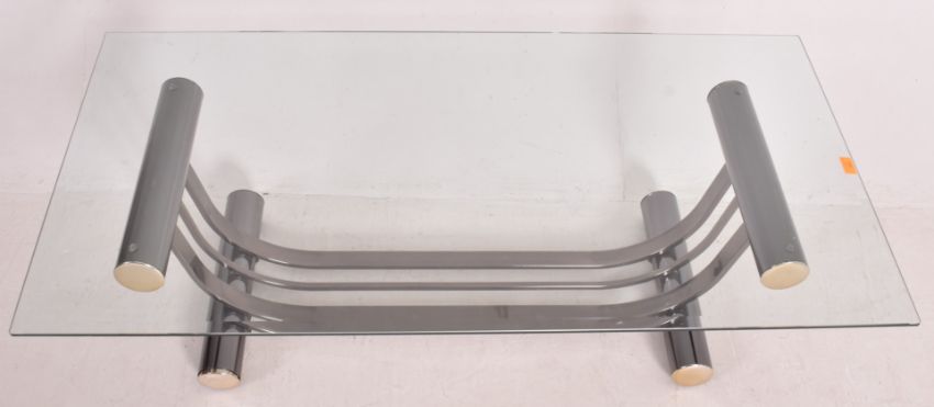 An American contemporary glass & chrome occasional low coffee table. The table having a bevelled edge glass top all raised on a chrome architectural tubular base.