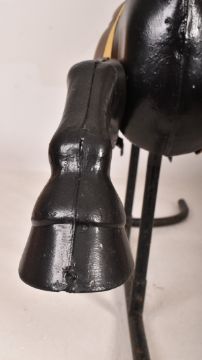 A vintage mid century funfair / fairground / playground believed Mobo Range Rider child's tin rocking horse. The horse painted with black and yellow body on a frame. Raised on horseshoe ended chrome supports.