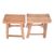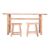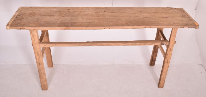 A vintage 20th century reclaimed elm console / hall table with two stools. The table of rectangular form with upright angled supports united by perimeter dual stretchers in a peg joint. Together with a pair of peg joint stools with varying height stretchers.