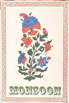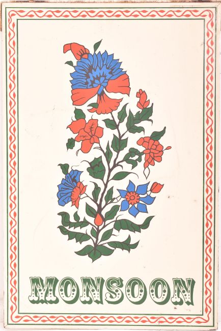 A vintage 20th century restaurant or shop double-sided hanging sign for Monsoon. The sign of rectangular form having cream ground with central floral decorations over the name below. Iron hooks atop.