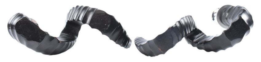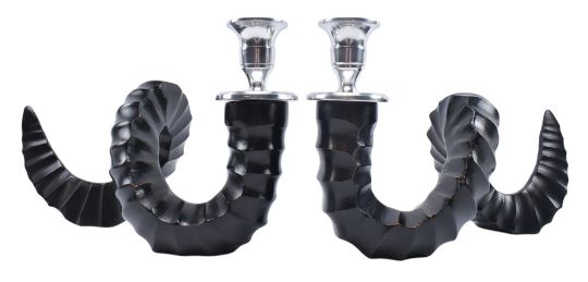 A pair of modern design cast metal and chrome horn shaped candlesticks. Each candlestick holder with chrome drip trap over turled horn shaped black painted body.