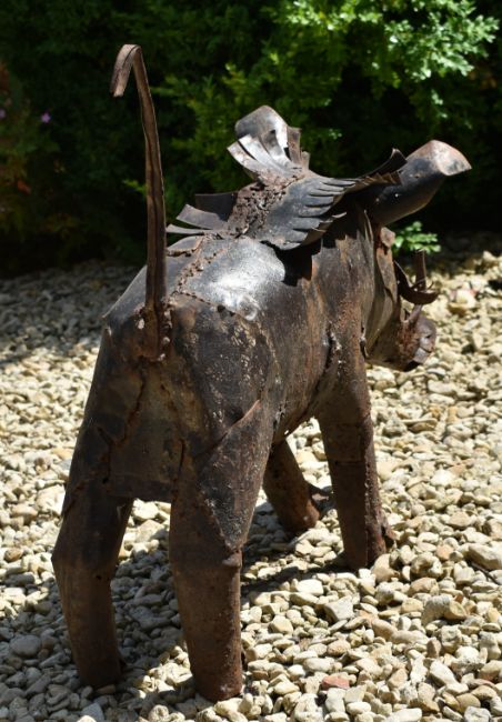 A vintage cast metal decorative outdoor garden figural sculpture of a warthog. The warthog comprised of panelled cast metal strips.