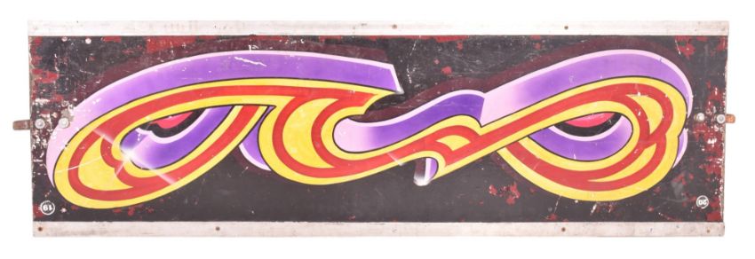 A vintage mid century funfair / fairground painted wall panel sign. The sign in purple colourway with decorative pattern.