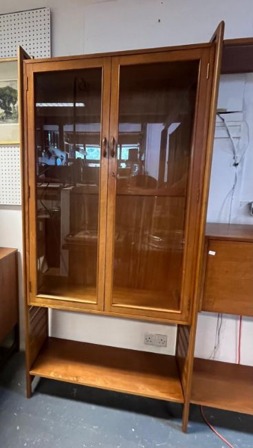 Robert Heal for Staples - Ladderax - a retro mid 20th century circa 1970s teak & metal three bay modular wall freestanding system. The wall system comprising various shelves, a glazed front twin door cabinet cookcase, a fall front bureau cupboard, a single drawer unit, a twin sliding door cupboard unit. Side ladder supports and brass supports present.