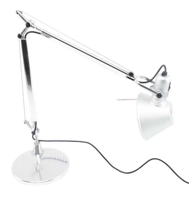 Michele de Lucchi & Giancarlo Fassina for Artemide - a Tolomeo Mini articulated architect's desk lamp. The table lamp of polished aluminium with strung wire mechanism. Raised on circular steel base. Labels present.