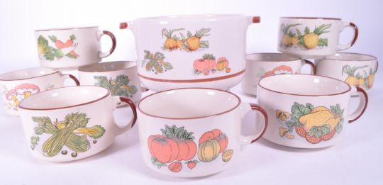 A collection of mid century circa 1970s ceramic soup bowls and serving bowl. Having nine bowl / mug cups with handles depicting variety designs including celery, mushroom, onions, chicken etc. With larger serving bowl.