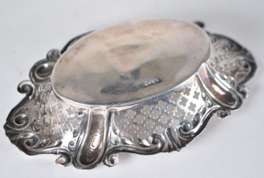 Silver - A Sheffield 1907 silver bonbon / pin dish with ornate pierced sides, accompanied by a sterling silver and marcasite Art Deco ring 5.2g size K. Z53/1 and marked James Dixon & Sons Ltd to basket.