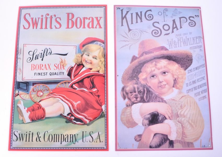 Two vintage style metal advertising point of sale signs. King of Soaps, made by W & H Walker, Pittsburgh. Together with a similar example, Swift's Borax soap.
