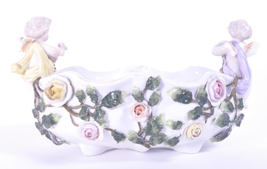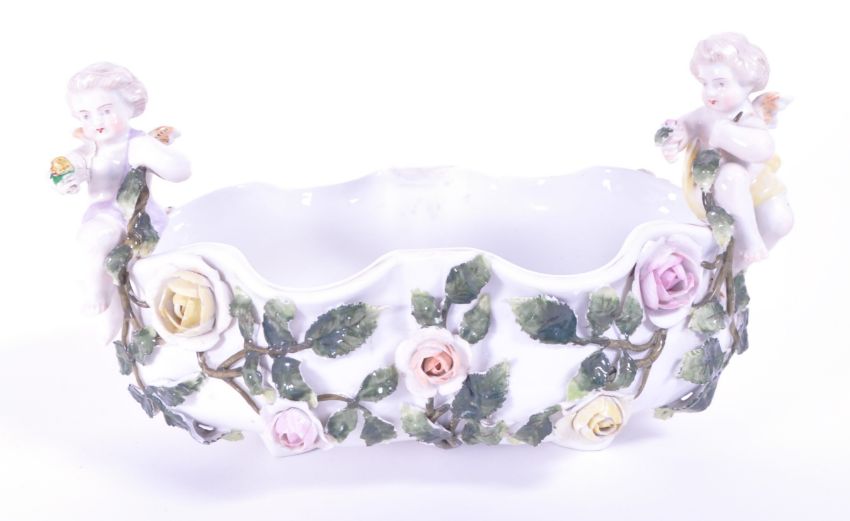 Sitzendorf - Late 19th century porcelain flower basket bowl encrusted with hand painted relief flowers and leaves to the exterior with two cherub figures sitting on either side. Stamped 263 to the underside, with makers mark. Measuring approx. 12.5cm x 24cm x 12cm. Sold AF.
