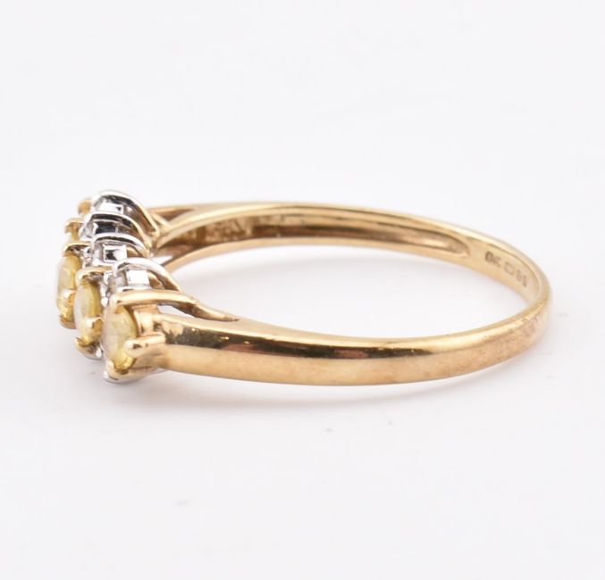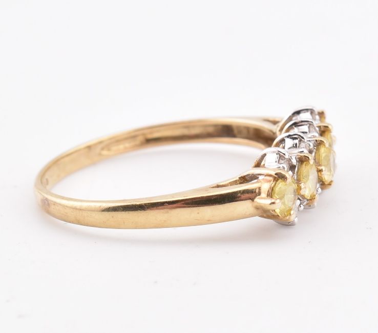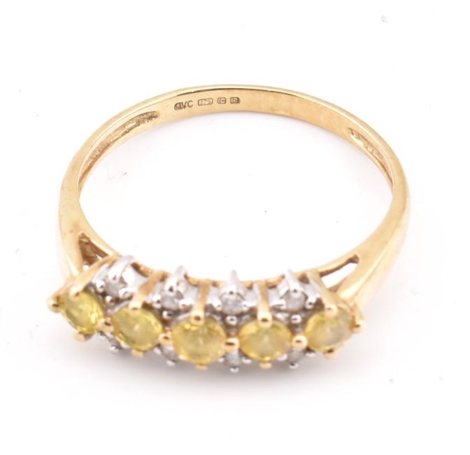 A hallmarked 9ct gold yellow sapphire and diamond ring. The ring set with five round cut yellow sapphires interspaced with 8 round brilliant cut diamonds. Hallmarked Birmingham sponsors mark QVC. Weight 1.8g. Size P.