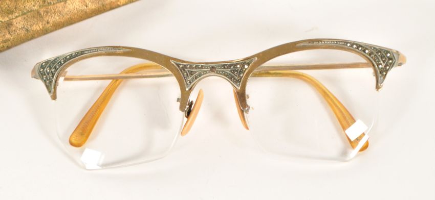 Goldray - A mid 20th century pair of cat eye reading glasses. Having a gilt frame and arms, frameless lenses with diamanté decoration. With flip over carry case.