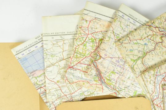 A collection of x7 WWII Second World War revision maps of Scotland comprising sheet 73 Falkirk & Motherwell, 74 Edinburgh, 79 Lanark, 80 Peebles & Galashiels, 85 Hawick & Eskdale, 87 Newton Stewart and 88 Dumfries together with an opisometer.