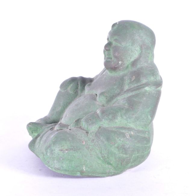 An early 20th century metal Chinese laughing Buddha, Hotei. Patinaed throughout in a seated position. Measuring approx. 11cm x 11cm x 12cm.