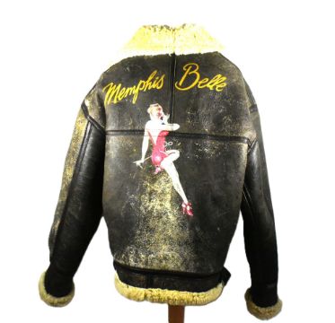 Memphis Belle - a vintage 1990s Memphis Belle flying jacket made for the production of the 1990 movie. Brown leather sheepskin with zip fastening and two buckle fastenings to the collar, the back decorated with yellow painted lettering 'Memphis Belle' and an image of a girl on an aircraft, label inside reads ' Memphis Belle Ltd, Original Designs, 1990 The Bountiful Company TM, Warner Bros Inc, 100% real sheepskin, Made in England '.