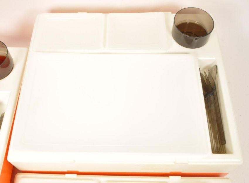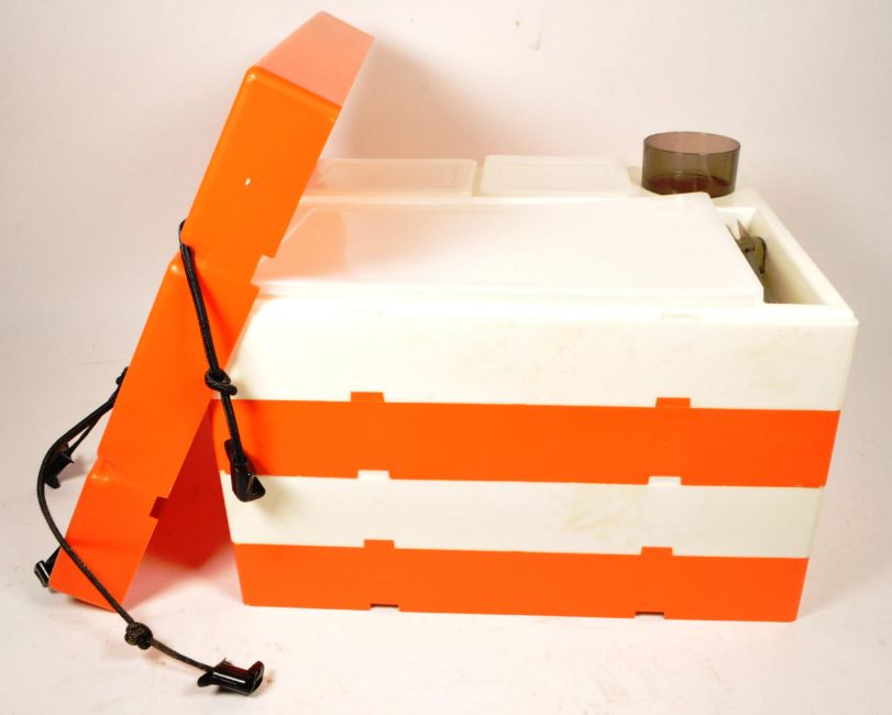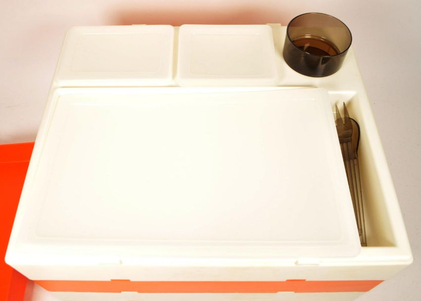 Pac-A-Pic - A retro mid century, circa 1960s / 70s Pac-A-Pic plastic stacking picnic box. In orange and white colourway and elastic cords.