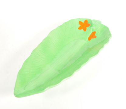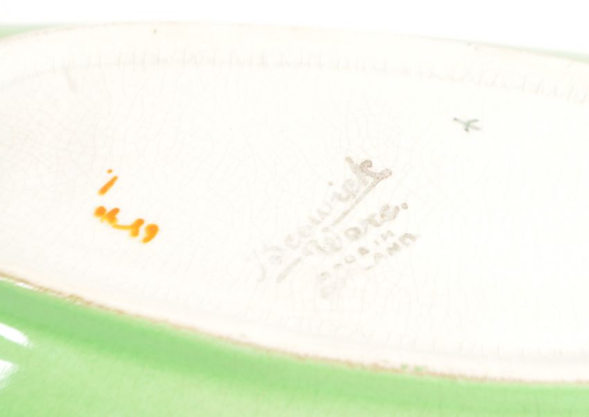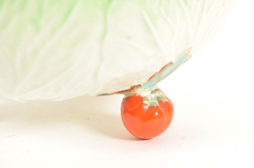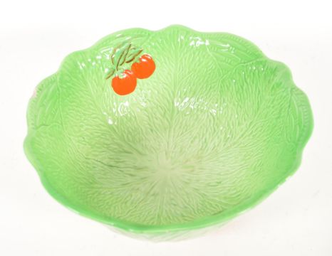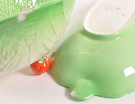 Beswick - Late 20th century cabbage pottery dish and bowl. Bowl in a bright green colourway with hand painted tomatoes and raised on three tomato shaped feet. Dish in a leaf shaped form with hand painted orange flowers to the bowl. Both with makers' marks to their undersides. Largest measuring approx 12cm x 23cm.