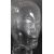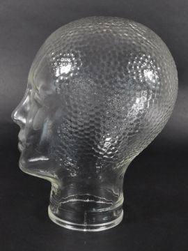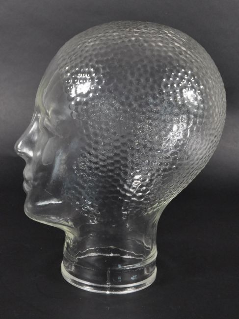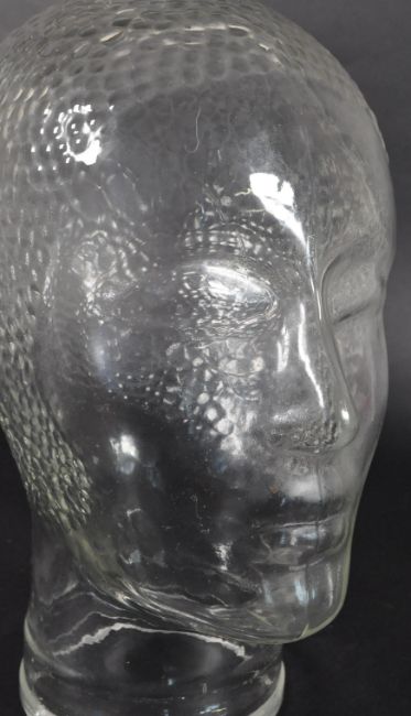 A vintage 20th century clear glass shop milliners mannequin head. Having mottled hair, with eyes, nose and lips features.