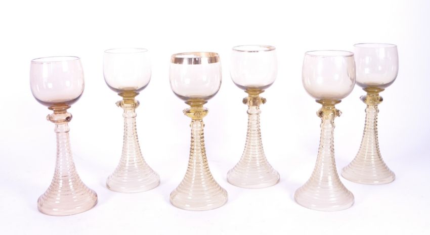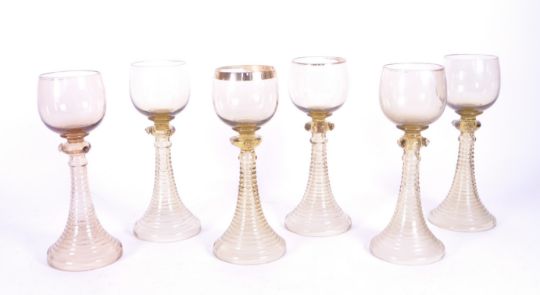 A set of six Swedish 1980s bee hive drinking glasses. Ribbed tapering base with rose finials to side with bowl top.
