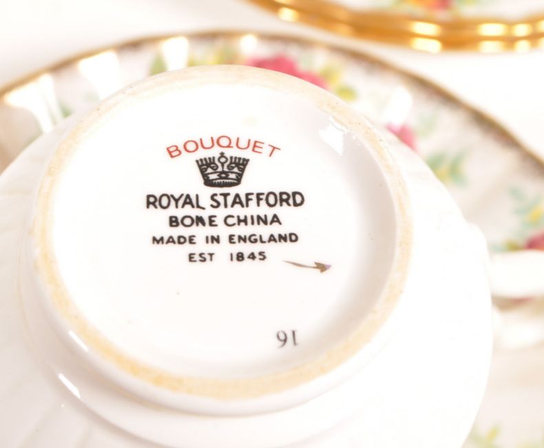 Royal Stafford - A vintage mid 20th century Royal Stafford Bouquet pattern bone china tea service. The service to include a milk jug, sugar dish, saucers, tea cups, and other items. Each decorated with floral rose designs, on white ground.
