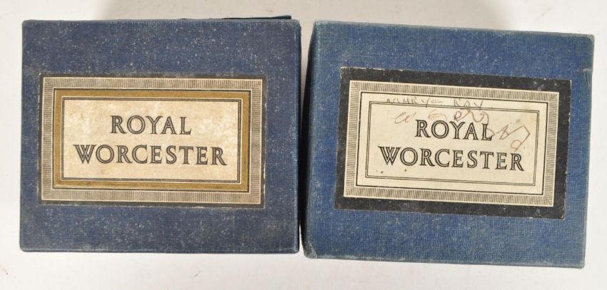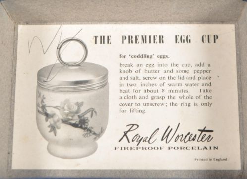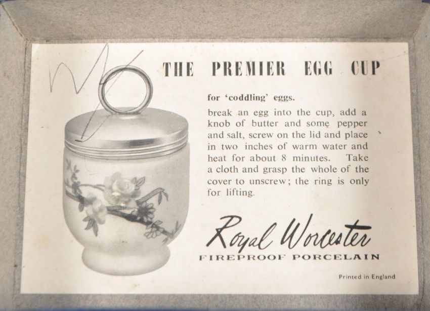 Royal Worcester - Two mid 20th century porcelain egg coddler twin boxes. 'The premier egg cups' in original boxes, each containing two. The egg coddlers having white metal lids atop, with white ground to porcelain and floral spray design to sides.