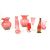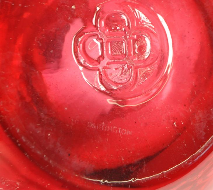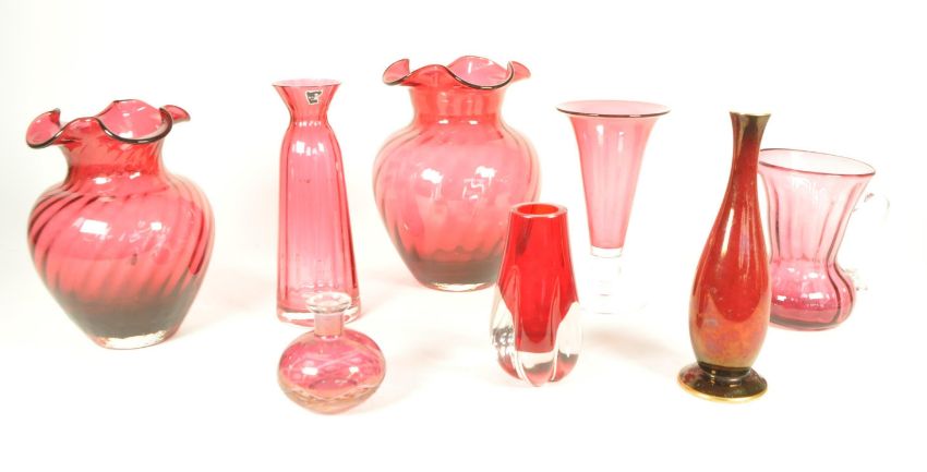 Collection of eight pieces of 20th century cranberry glass. Examples including two Dartington vases, a handled jug, a Whitefriars manner hambone vase, a crystal cut perfume bottle, and other small slender vases. Largest measuring approx. 21cm tall.
