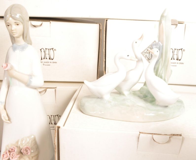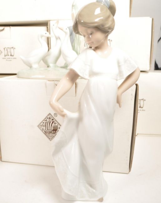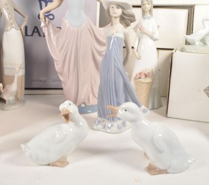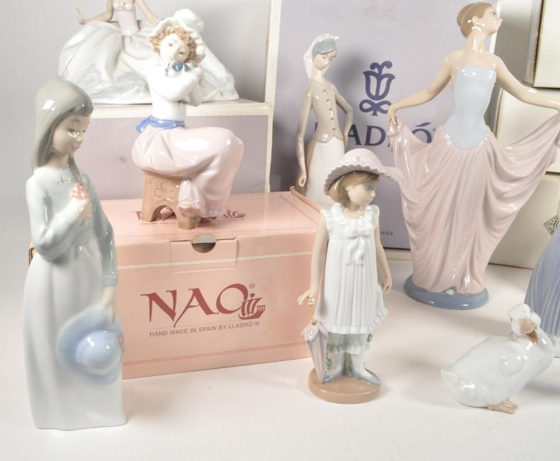 Lladro / Nao - A collection of vintage 20th century Lladro and Nao by Lladro porcelain figures. The collection featuring examples such as 'girl with umbrella', 'spoiled dog', 'group of ducklings', 'flared nightgown', 'dreaming girl', 'at the ball', 'dancer' and other figures. To include approximately eleven figures in total. Mostly in boxes.