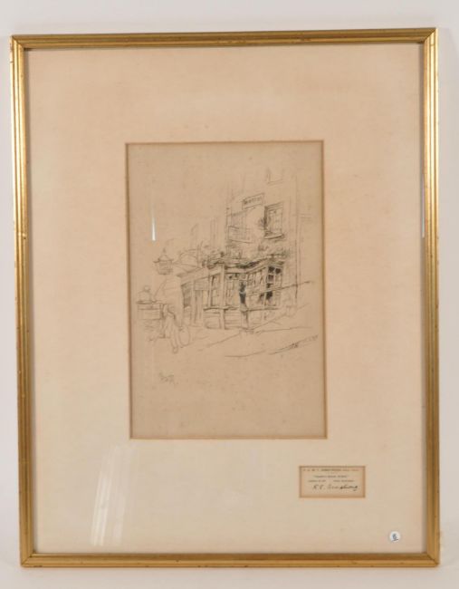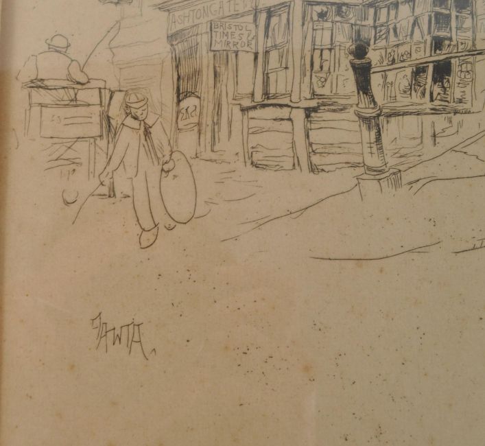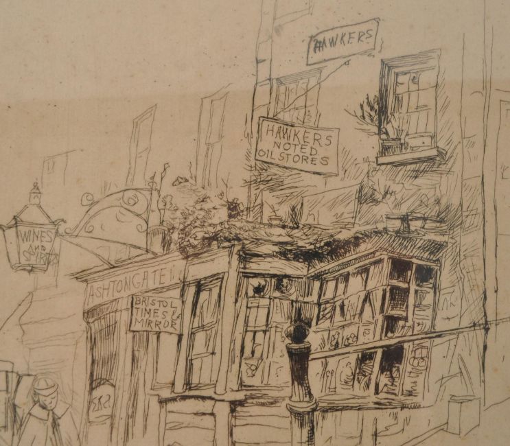 Francis Abel William Taylor Armstrong (1849 - 1920) - Late 19th / early 20th century etching titled 'Hawker's Stores, Bristol' limited edition of 37. Signed by the artist in pen and ink to the bottom right corner. Depicting a street scene in Bristol. Framed, mounted and glazed, measuring approx. 49cm x 38.5cm.
