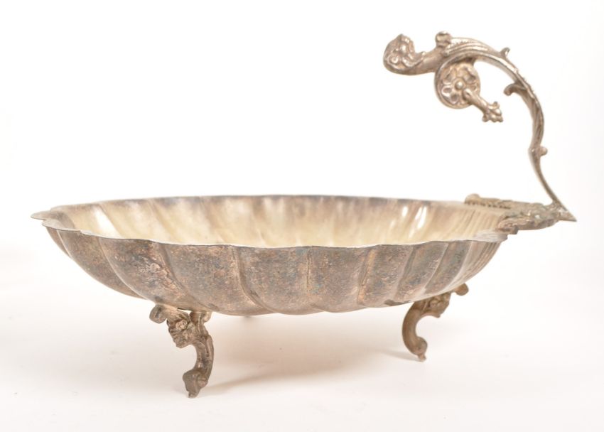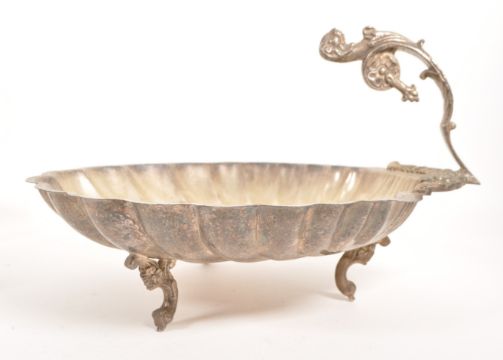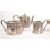 Late 19th century Victorian silver plated part tea service. Comprised of a George, Michael & Sons EPBM silver plated teapot, an Arthur E. Furniss twin handled silver plated sugar pot, an unmarked silver plated milk jug and a scalloped shell dish raised on three feet and with a lions head shaped handle. Largest piece measuring approx. 19.5cm x 33cm x 28.5cm.